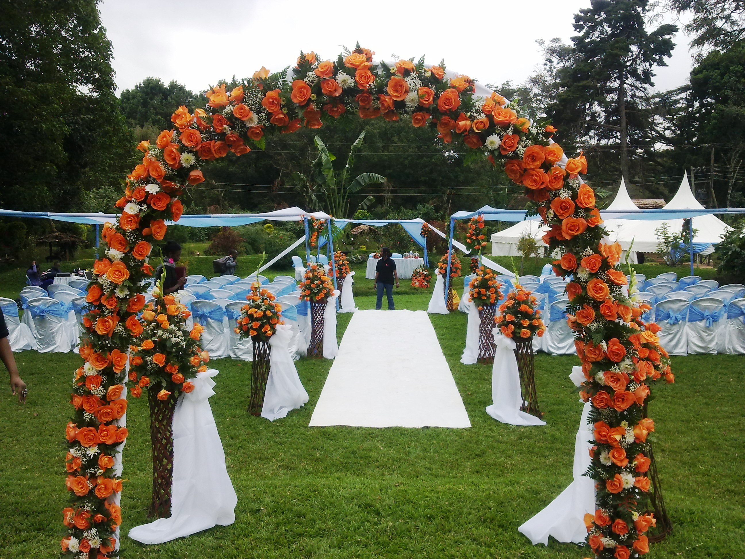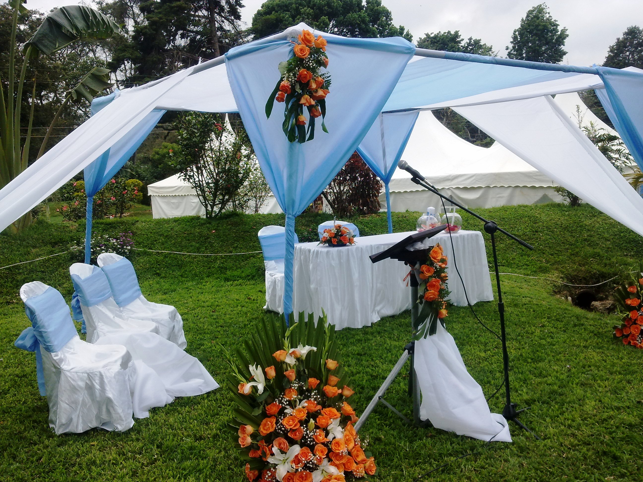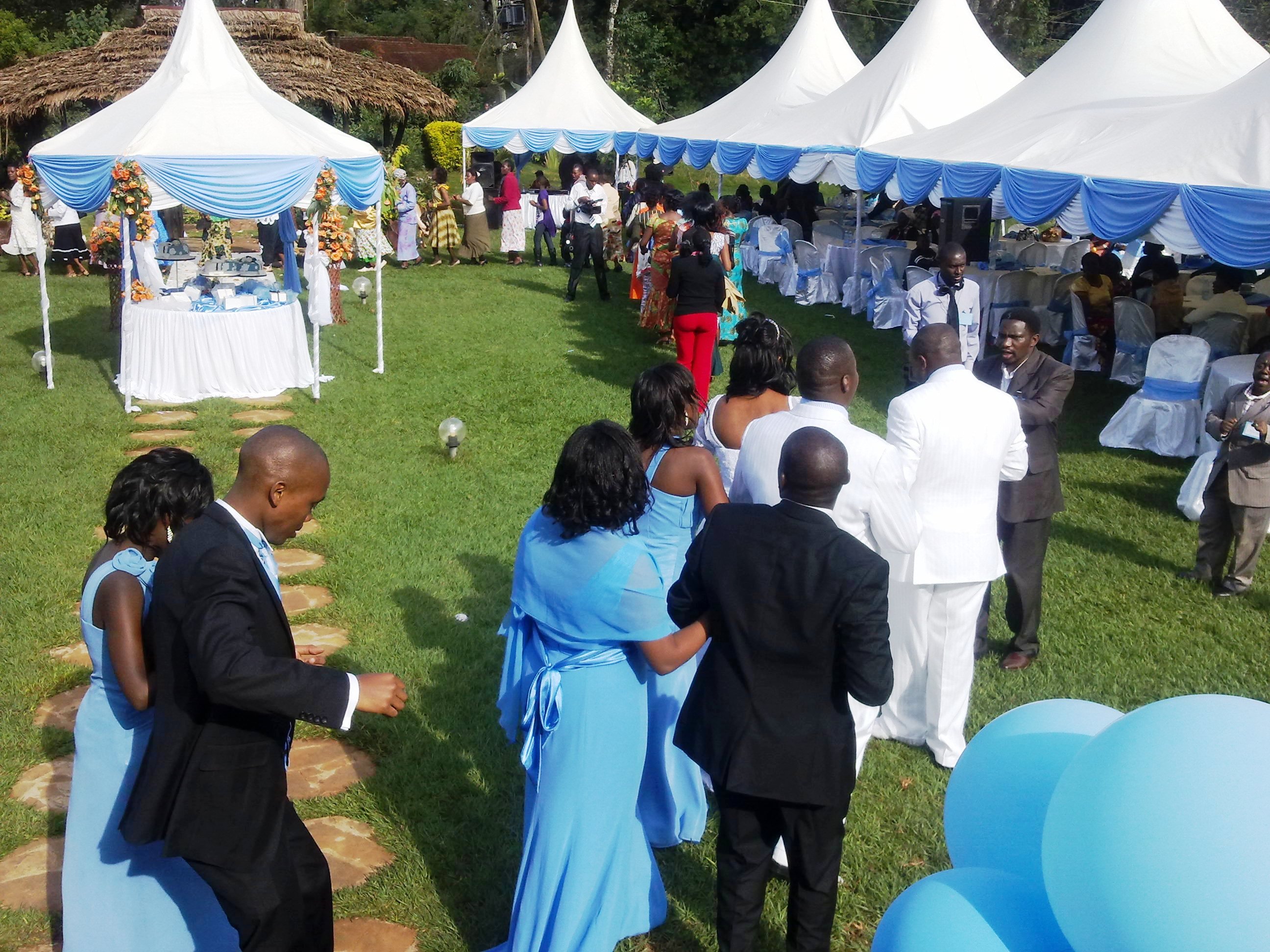 This is where we came in as The Harusi Company. Thanks to technology, good planning skills, an available bride who was always online with us and a groom who knew what he wanted for his bride we were able in a span of 6 months to prepare a wedding for what was initially supposed to be for 200 guests that eventually became for 300 guests. Now Naomi loves blue and she knew the exact blue she wanted which was not very easy to get here in Kenya but with a lot of walking around and eventually placing an order for the fabric to come from Dubai we were able to have an elegantly beautiful blue and white wedding in Tigoni. The venue selected was absolutely beautiful as it gave the contrast to the color scheme. Naomi and Michael were very specific from the word go, theirs was going to be an elegant outdoor wedding and the bride especially wanted her princess bride moment and we gave her a queen bride moment as she was definitely the queen on that day.